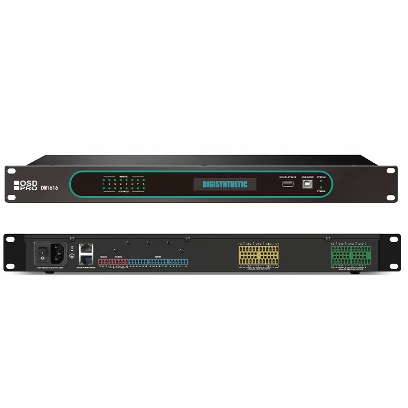 OSDPRO DM1616数字网络音频处理器 集成88凤凰端子平衡模拟输入/输出(包含8通道 48V幻象电源)和88 AES67 IP音频通道(48/96kHz/24-bit),形成混合模拟-网络音频枢纽。配备用户可编程DSP库,支持5A算法实现声学回声消除(AEC)、自适应噪声抑制(ANS)和反馈控制(AFC),可在所有通道实现实时处理。双USB端口提 供UAC和USB音频支持,8个GPI和8